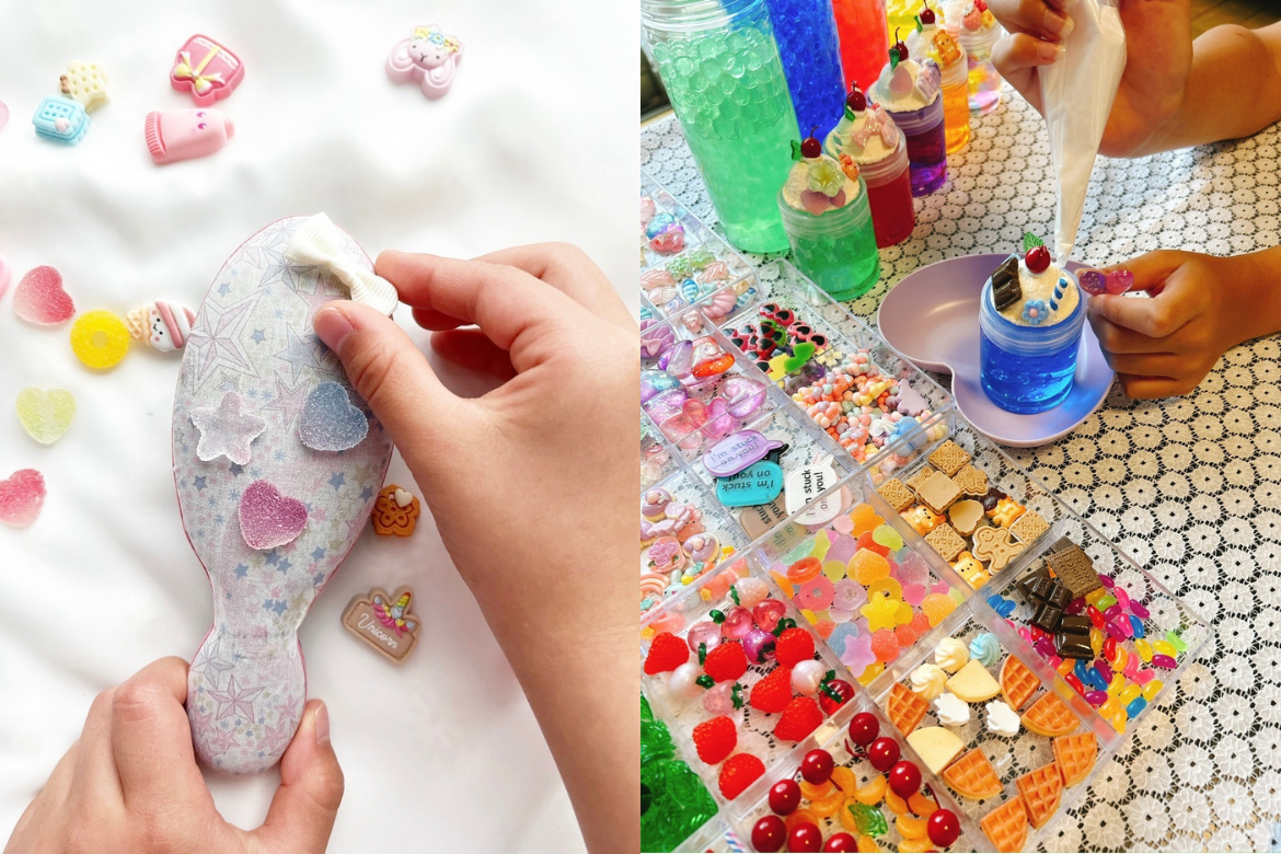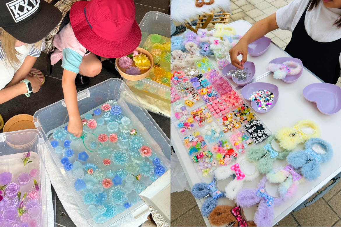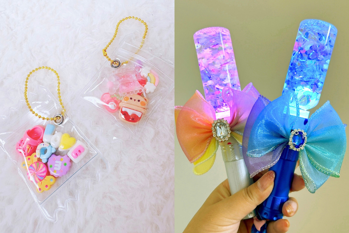 キラキラでカラフルな素材を使って作る、オリジナルのペンやキーホルダーなど